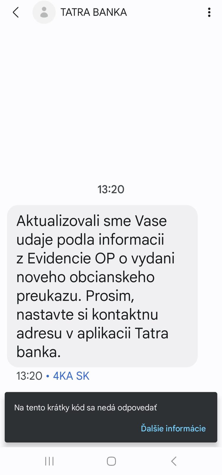 Podla mna ta smska vyzera seriozne, nie je tam ziaden link, iba oznam ze sa mas prihlasit do aplikacie a aktualizovat udaje. Co pre uzivatela nepredstavuje ziadne riziko, aj bez smsky sa predsa uzivatel prihlasuje do aplikacie.