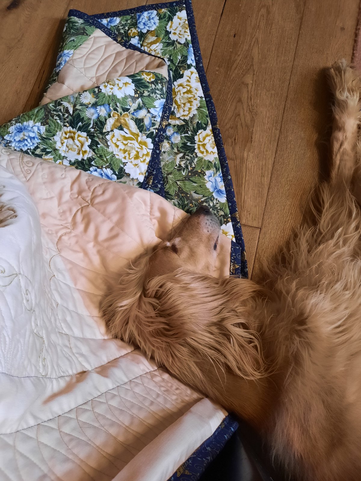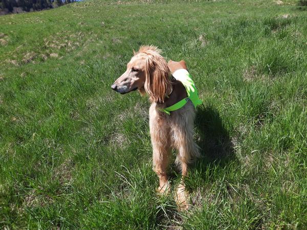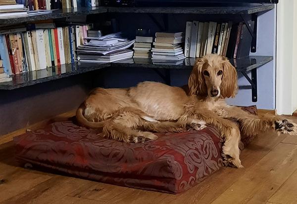 Dlho som túžila po saluke, máme mix. Srsťou tiež, preto ho dávame zostrihnúť na peržana. Na poslednej fotke vidieť, že je nám rád nablízku. Šila som v rukách, sediac v kresle. Hoci mal ležovisko, prišiel si mi ľahnúť k nohám.