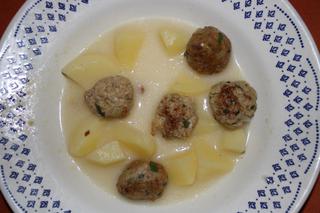 500 g malych zemiakov,1 žemla,1 hrnček mlieka,600 g mesoveho vyvaru,1 cibula,500g mleteho mesa,1pl petržlenu,1 vajce,1pl masla,200ml smotany,300g hrašku,sol,mlete čierne korenie žemlu namočime do mlieka.Zemiaky nakrajame na menšie kusky,Pridame do horuceho vyvaru a varime 25 minut do mekka.V miske zmiešame vyžmykanu žemlu s mletym mesom petržlenom a vajcom,.Ošupanu cibulu pokrajame na drobne osmažime na masle a pridame k mesovej zmesi.Osolime ,okorenime a premiesame.Tvarujeme ztoho gulky ktore osmažime na masle.Do vyvaru zo zemiakmi pridame,smotanu ,hrasok( ja som nemala doma) a mesove knedliky.Polievku dochutime solou alebo vegetou.
