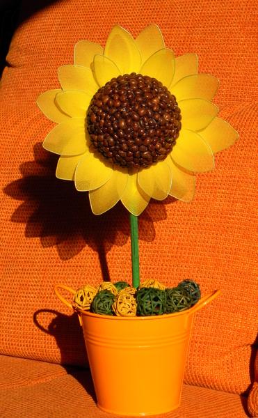@mima1311 teší ma, že sa páči, tu je návod ;) polystyrénovú guľu rozrezať na dve polovice. oblú časť pologule natrieť na hnedo, aby nepresvitala biela farba polystyrénu. na husto ponaliepať kávové zrná. pretrieť lakom. nastrihať drôt, vytvarovať okvetné lístky a tvar zafixovať pevným stočením koncov drôtu. silonku natiahnuť na pripravené lístky, pevne napnúť, na konci prišiť, aby dobre držala. takto pripravené lístky ponaliepať zo zadnej, zrezanej strany pologule. rovnako zo zadnej strany nalepiť paličku (stonku), natretú na zeleno a nalakovanú. do kvetináča vložiť kus polystyrénu a slnečnicu do neho zapichnúť. polystyrén v kvetináči zamaskovať v podstate čímkoľvek. chcela som použiť kvetinársky sisal, ale nechcelo sa mi bežať do obchodu, tak som použila, čo dom dal. ešte chcem z druhej strany slnečnice nalepiť druhú polystyrénovú pologuľu s kávovými zrnkami, aby bola obojstranná. chcem ju dať totiž do okna, aby aj z vonka bol na ňu pekný pohľad.