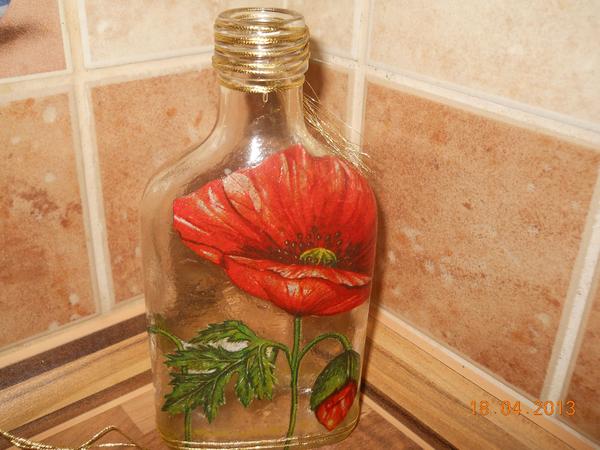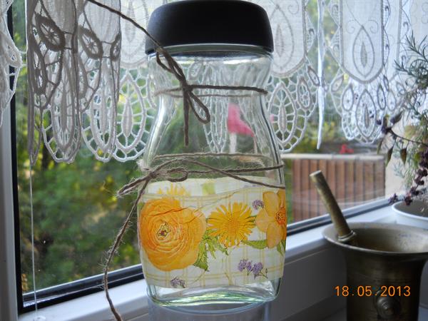@hojda tieto sklene nadoby/fľašky sú dokonca úplne bez farieb, použila som rovno lepidlo na decoupage a servitok alebo textil, nakoniec prelakovala. svietnik je len malovany farbami na textil -tymi v tube