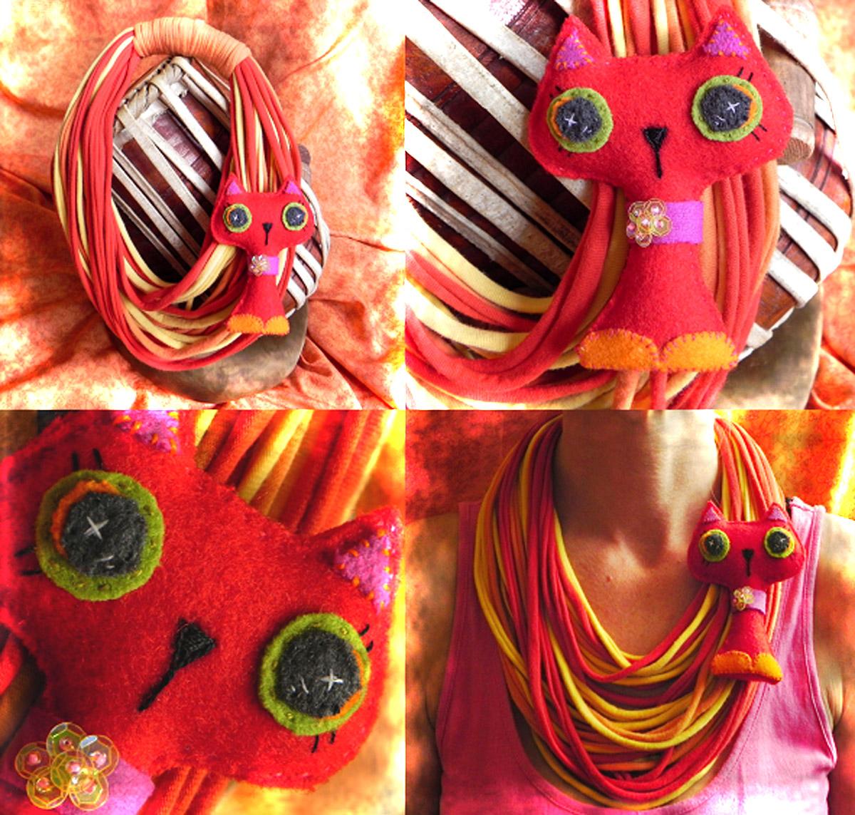 Špagetový náhrdelník z tričkoviny v žiarivých, letných farbách, s ohnivou broškou z filcu (10 x 7 cm).