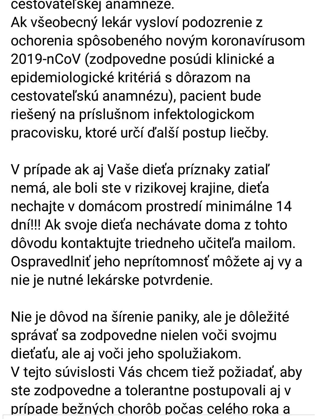 Škola dala takýto oznam, je v ňom, že ak sme boli v rizikovej krajine, nemáme dávať deti do školy. My sme boli v pondelok vo viedni a predtým lyžovať v taliansku, ale nie v postihnutej oblasti. Ja celkom nechápem celú túto paniku. Čo bude, ak dám dieťa (zdravé) do školy? Ďakujem
