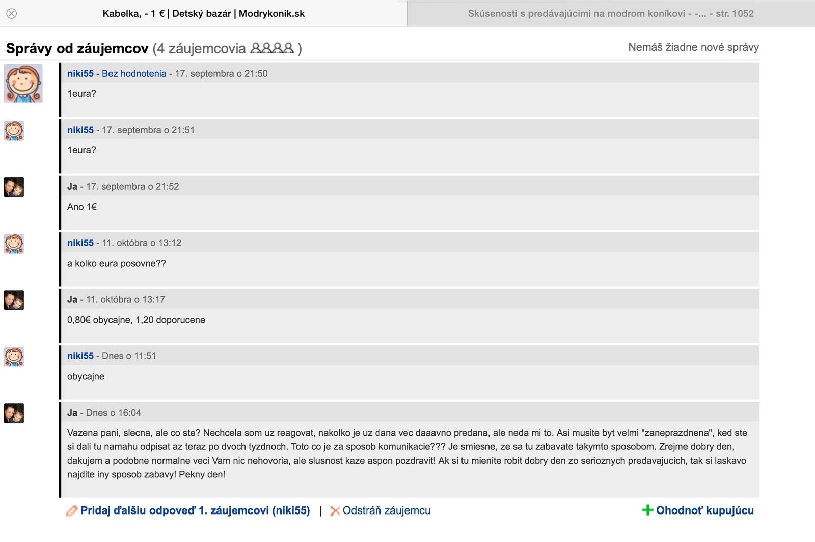Ako nechapem, ale slusnost sa tu na bazarikoch akosi vytraca. Niektore uz ani oslovenie, ani bu ani mu nenapisu. Som niekedy normalne odpisovala, ale ked niekomu nestojim ani za dobry den, tak sa s nim uz bavim aj ja. Ale toto ma dorazilo! Podotykam, ze odpisala po vyse 2 tyzdnoch. Akoze komunikacia ma urovni!!! 😠 😠 😠
