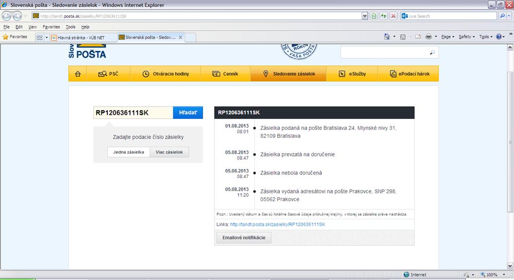 ad2) 2. a 3. obrázok sú pre porovnanie - na prvom z nich je presne zaznamenaný pohyb zásielky, všetko ok. O druhom však neviem, čo si myslieť - prevzatá na doručenie bola 5.8. doručená 6.8. - kde teda bola tých 24 hodín? Prečo sa záznamy líšia, ak išlo o rovnaký druh zásielky a rovnaký scenár?