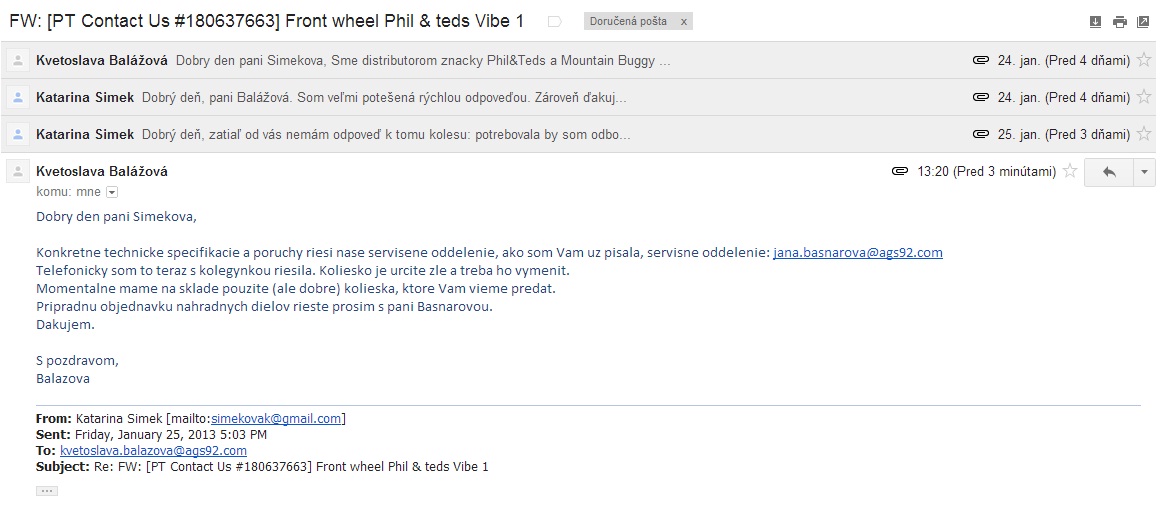 Prave som dostala odpoved na mail (pridavam foto-printscreen) ohladom kolesa ku kociku ktory kupila @saska124 od predavajucej @skripova. Odpoved je od autorizovaneho predajcu kocikov Phil&teds (a aj nahradnych dielov), sama predavajuca odporucila urobit tento krok a overit si ako ma byt koleso spravne.