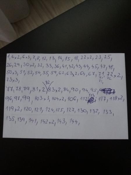 Potrebujeme: 5,6,8,9,11,16,17,20,22,23,27,32,37,40,43,46,47,48,50,53,54,56,57,62,63,68,69,71,72,76,78,85,88,90,92,93,95,96,97,98,100,102,104,108,109,110,111,114,118,124,126,127,129,130,132,137,138,141,144