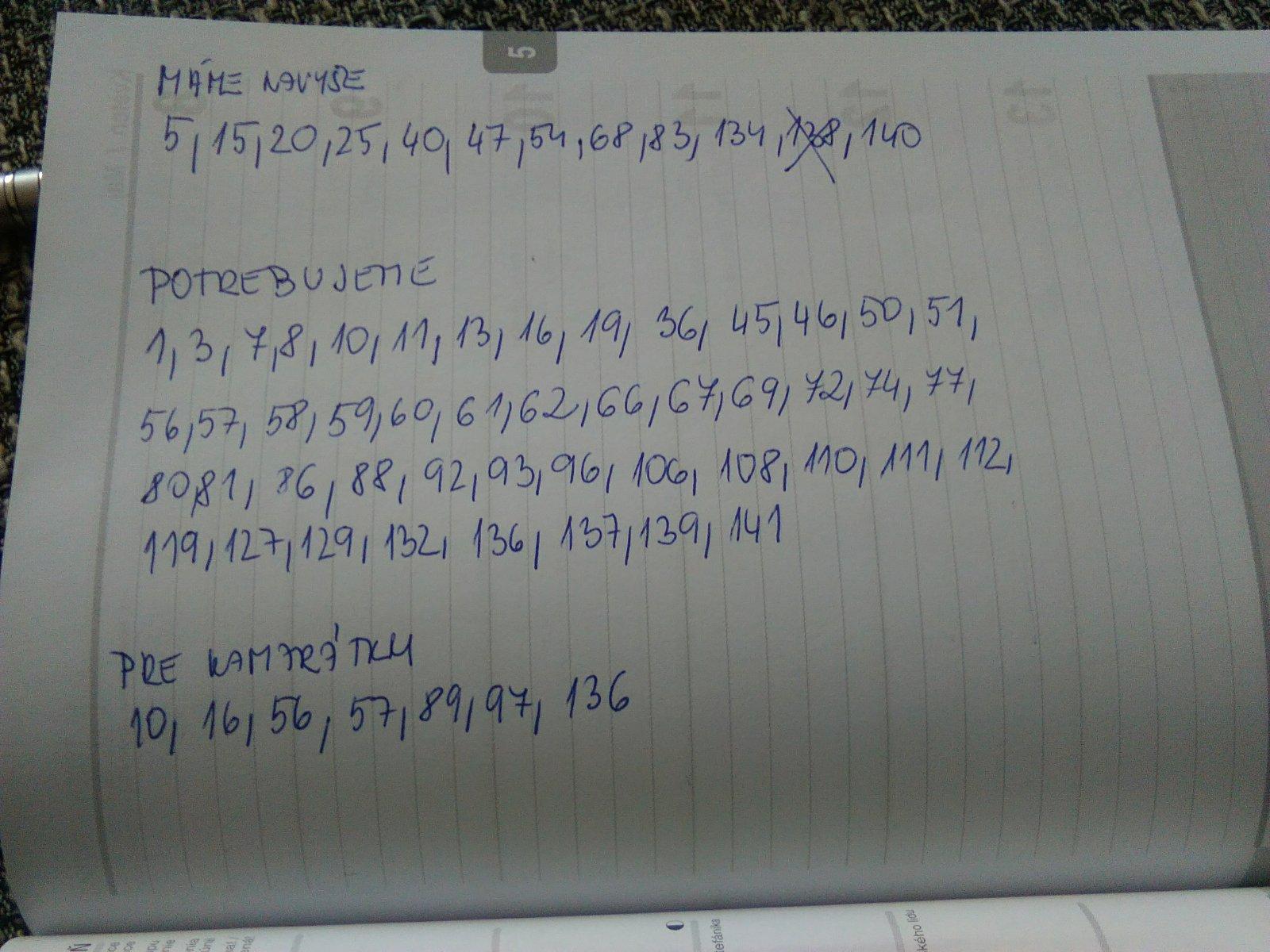 @myya ahoj ja mám pre teba 79 a 143 ak by si ešte potrebovala.... nám chýbajú tieto: 4,13,20,21,24,27,30,42,50,53,56,60,67,70,98,124,129