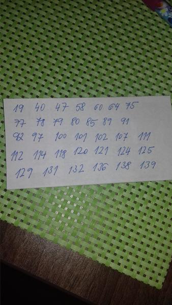 Ahojte, mame cisla : 1-7x, 8, 10, 13,14,15,20,21,23-4x, 26, 30-3x, 31-3x, 36-3x,41,43-5x, 50,51-2x,52, 61,63,69-2x, 71, 75,76-2x,77,80,83,89-2x,92,93,94-2x,95-3x,97,102,105-3x, 106-3x,107-2x,108,109-2x,113-3x,117-2x,119-2x, 124,131-3x,135,138-2x,139,141-4x, 144-4x.