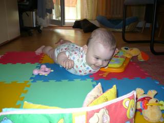 Jinak u nás je nové to, že malá leze po 4 a chodí za ruce, snaží se postavit, ale ještě jí to nejde, je kouzelná, taky se pořád bouchá do hlavičky.