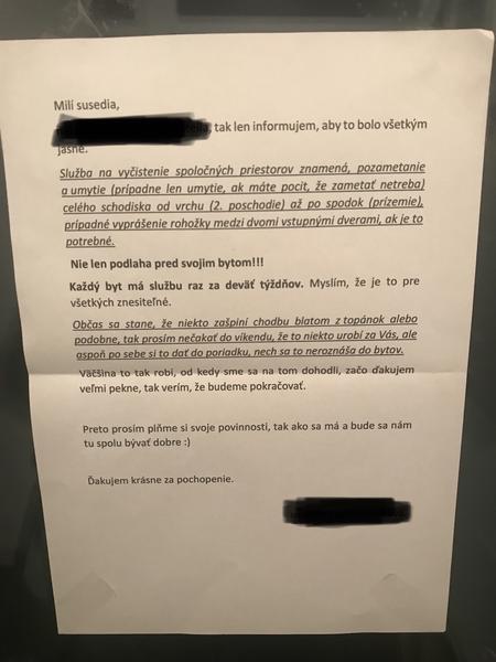 Tak dnes som si spomenula na tuto diskusiu.... aby bolo jasne byvame na prizemi.. a mame taku aktivnu susedku, ktora stale dava nejake oznamy... zvacsa sa na tom smejeme lebo riesi veci, ktore ani nie je riesit potrebne. Ale asi pred mesiacom spravila take hodiny, kde su nase mena a vzdy kto ma umyvat tak to na neho natoci.. lenze.. ja som si povedala, ze nebudem umyvat poschodia kde som v zivote nebola, pre mna to nema logiku. Navyse som doma na rizikovom, tak sa tam nebudem nadrapovat s kyblom... cize ked je na mne sluzba tak povysavam vchod a prizemie plus ho cele zmyjem... inam nechodim tak ma netrapi.. na margo toho ma dnes na dverach cakal tento oznam.. ja neviem ako toto diplomaticky tak riesit aby ostali vztahy v dome s touto pani na poriadku... ked stale toci tu sipku na moje meno, ze vraj kym nezmyjem aj prve a druhe podlazie aj schodiska 😂/. Ako by ste toto riesili vy? Moj milovany jej chce napisat slusnu spravu do schranky, ja jej chcem poklepat na celo ci je normalna.