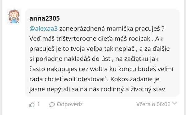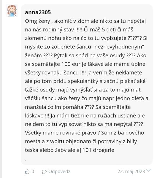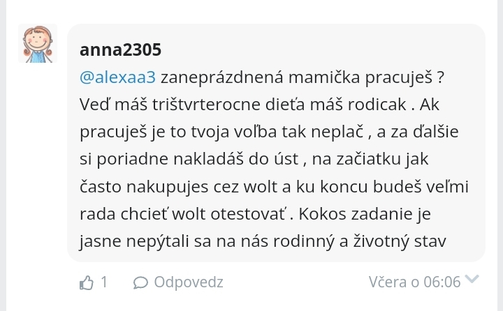 Dobrý deň dámy a aj admini . Bola by som šťastná že nezmazanie diskusie . Nedávno mi vysokovýkonné upozornenie - zapoj sa do súťaže s woltom . No po prečítaní komentárov som sa tam ani nezapojila . Popis súťaže je jednoduchý - odkiaľ si a či vieš objednať z marketov a 101 drogerie . Veľa úžasných mamičiek tam pridalo screenshot a odpovedalo na tieto dve otázky . Ostatok ? Začali tam vypisovať aké to majú ťažké , úrazy , viac deti , nespokojne deti , niektoré mamičky dokonca pracujú pri mesačných bábätkách . Úprimne ? Každá z nás má nárok na rodicak do troch rokov . Tak že pracuje asi musí nie alebo čo … koľké z nás sme na rodidacku 300 či 400 eur a musíme žiť . Že manželia sú pracovne vyťažení . Ktorej z nás nie sú? Je mi smutno z toho , že polovica mamičiek tam napísala výlevy . Verím každej jednej . Ale takisto viem že každá jedna z nás to má ťažké !!!! Ja mam tiež náročné dieťa s muzom som maximálne hodinu vecer celé dni v práci . Ale mam to tam vypisovať ? Koľké z nás nemajú pomoc starých rodičov