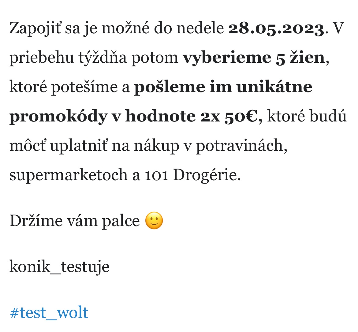@acer11 presne z toho že veľa mamičiek tam napísalo odpoved a a odpoved b . Ale veľmi veľa žien tam rozpísalo príbehy z ktorých niektoré ako som uviedla príklad že v prvej vete nakupujem s woltom každý deň a v poslednej veľmi rada by som vyskúšala nakup cez wolt . Že to je proste nefér