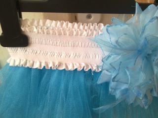 viazala som normálne na stuhu, odmerala som si, aký dlhý pás budem potrebovať a viazala a viazala. Dala som 80 kúskov, ale vlastne 40 uzlíkov, lebo som dávala dva pásy tylu na seba. Ešte by sa určite dala urobiť aj hustejšia, miesta bolo, ale už sa mi to zdalo priveľa. Potom som si tie uzlíky rovnomerne rozmiestnila po dĺžke stuhy a prišila k sukni. A šila som nie cez uzlíky, tie som trošku posunula nad kraj sukne a prešívala som cez nazberkanú látku.
