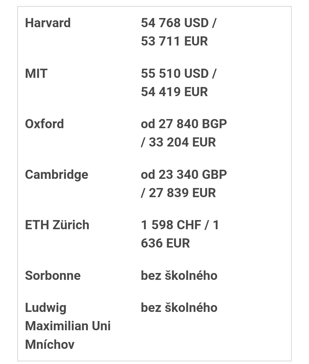 @akje prikladám výšku školného na prestížnych univerzitách, porovnávať ich so slovenskými dosť vtipne... Ci ty by si za 60 tisíc radšej študovala na SK?