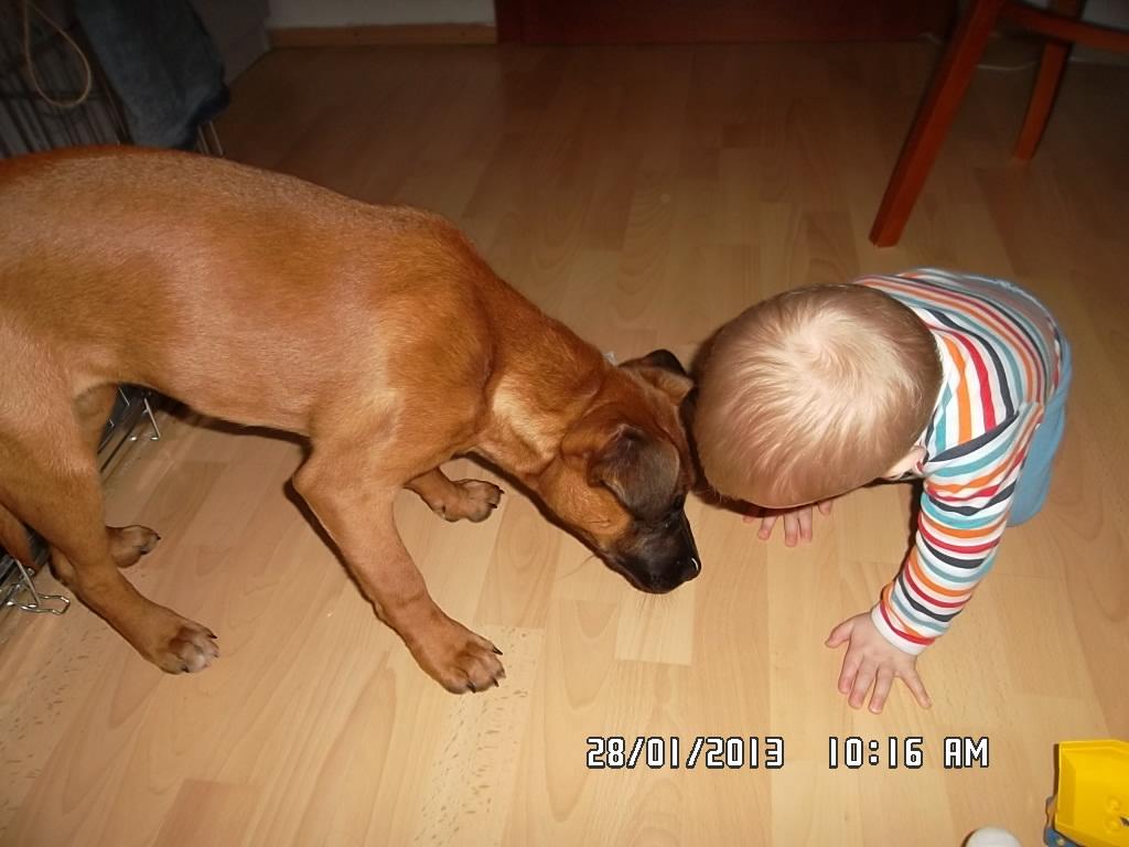 Naša Zara a náš syn sú partia ako sa patrí. Ešte nie je ani dospelá a už ho stráži ako oko v hlave. Vždy keď malý plače, ona dobehne a kontroluje či je OK. Malý jej môže robiť čo len chce, a ona si to vôbec nevšíma. Keď malý spí vždy ho ide skontrolovať 🙂 A že bojové plemeno?! Samozrejme že ich nenechávame samých bez dozoru veď istota je istota 🙂