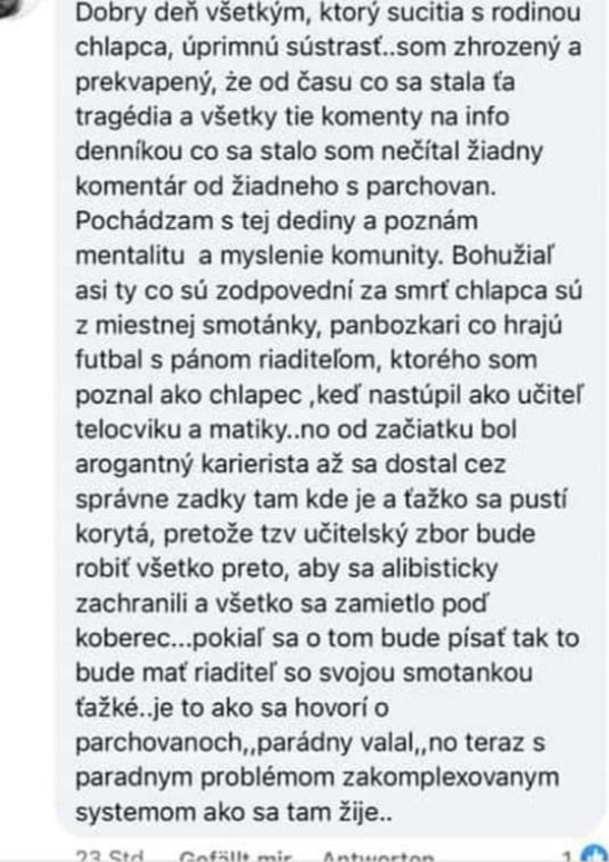 Verím tomu, že by neskončil, keby sa nedialo to svinstvo okolo. To že stal 50 minút svedčí, že bola ešte šanca. Dali mu ale ešte aj v takejto situácii vedieť , že ani keď sa chce zabiť na ňom nezáleží, že je nikto pre nich aj tak. Škola je jednoznačne vinník. Že to dovolila. Že zatvárala oči. Ten riaditel musí byť strašný fas. Jeho ego musí byť obrovské. A empatia na bode mrazu. Neverím, ze je to dobrý človek. A tie deti. To je čistá katastrofa. To je ako zlý sen. Že takéto niečo sa môže naozaj diať.