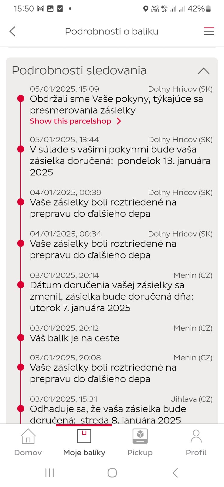 @denisa_deniska pretože balik poslal 30.12.2024 mal byť doručené 3.1.2025. Len ze som na sledovanie zásielky sa píše príde 13.1 pondelok