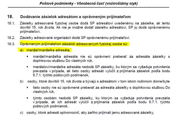 - manžel/manželka adresáta nie sú oprávnení preberať za adresáta zásielky s doplnkovou službou Do vlastných rúk,