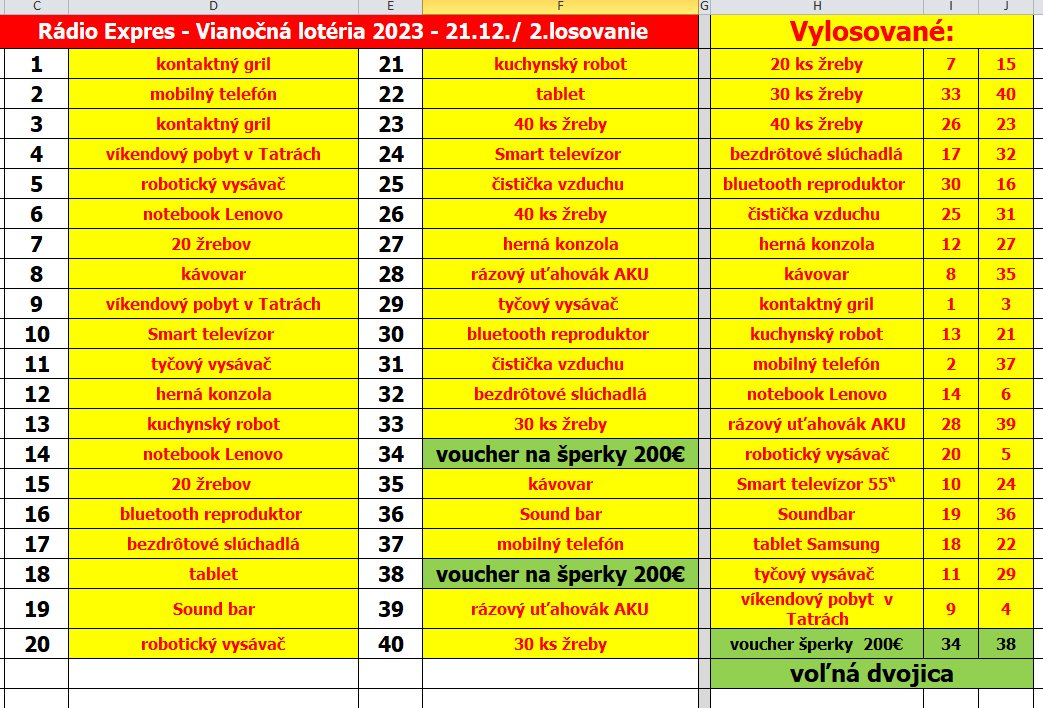 Vyžrebované výhry: 3 + 28 = herná konzola a 15 + 26 =tyčový vysávač. Ďalšie čísla sú 6 = bezdrôtové slúchadla; 10 = notebook Lenovo; 12 = kávovar; 17 = kuchynský robot bosch; 24 = 30 žrebov. 🙂
