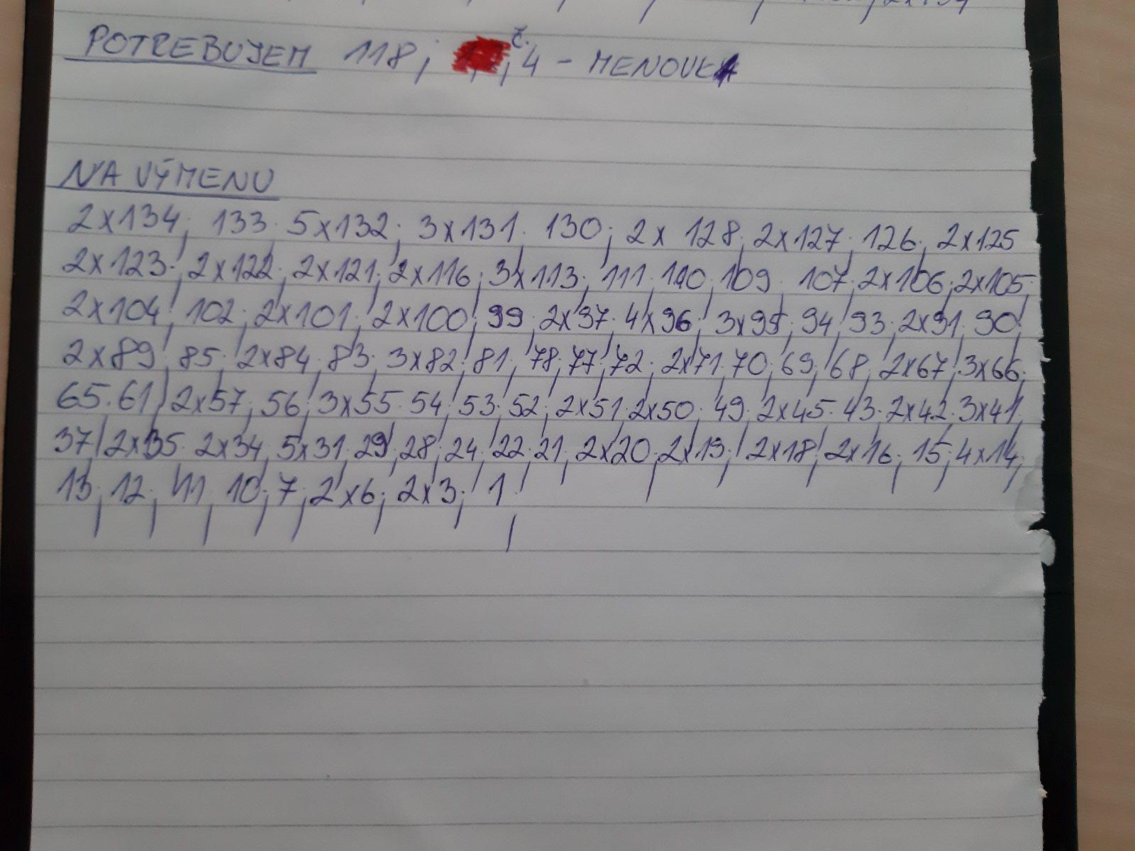 Na výmenu mám: 5, 6, 8, 9, 13, 15, 19, 22, 25, 26, 31, 37, 39, 41, 42, 47, 49, 50, 51, 55, 56, 57, 61, 62, 64, 69, 72, 78, 83, 87, 88, 89, 92, 93, 96, 98, 99, 100, 105, 108, 109, 111, 112, 126