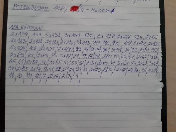 Na výmenu: 1,2,3,5,6,7,8,9,10,13,14,15,17,18,22,23,24,25,26,27,29,31,39,,32,33,34,35,36,37,40,43,44,46,49,51,53,54,55,57,60,61,62,63,64,65,67,68,69,70,73,74,76,77,78,80,83,84,85,87,88,90,91,92,94,95,96,98,99,103,106,108,109,111,112,113,114,117,118,122,126,127,129,130,131,133,134,135