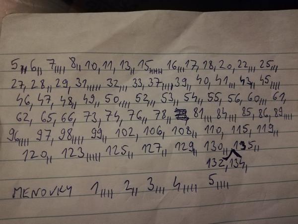 Zháňame: 5, 6, 8, 9, 16, 17, 23, 24, 25, 29, 34, 40, 49, 50, 56, 57, 58, 60, 63, 64, 68, 69, 70, 72, 73, 75, 81, 89, 93, 94, 97, 105, 106, 113, 117, 118, 120, 123, 128, 130, 132; menovka 1