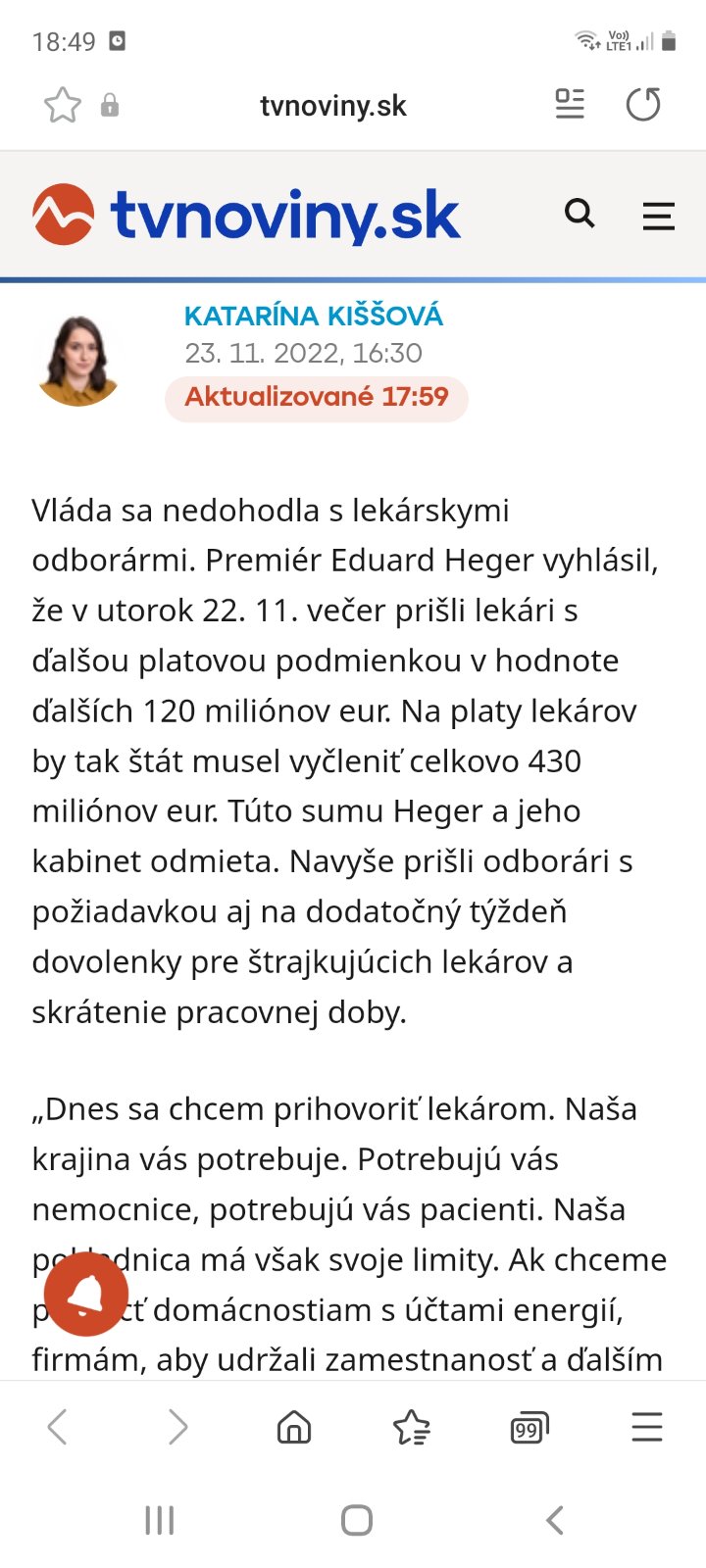 @zuzuliennka1 nech sa páči vydierajú vládu výpoveďami a požadujú od nich riešenia ohľadom nemocníc, vzdelávania, reformu. Ako bolo písané, je to všetko na dlhé lakte, tak radšej vláda zapchá lekárom ústa zvyšovaním platov a oni to nechajú tak, presne ako to bolo v roku 2011, či kedy to štrajkovali. Už som to viac krát písala v texte, ty si asi sedíš na kábli, aby si to pochopila. Som zvedavá, či niečo dotiahnu alebo zas len zoberú peniaze, keď to nepôjde, aby aspoň niečo z toho bolo a nechajú všetko tak ako je. Takáto diskusia je aj na FB, či pri každom článku v súvislosti s týmto na internete. Ľudia sa pozerajú realite do oči a píšu svoje názory a teda ty so svojimi vyjadreniami nenájdeš ani 10% podporu. Otázka času a budeme poznať výsledok na čom sa vláda s lekármi dohodla. Som zvedavá, čo z daných bodov sa naplní. Ak to zas bude len zvyšovanie platov a ostatné sa nechá tak, bude to znova len dno, ktoré vedia lekári preraziť.