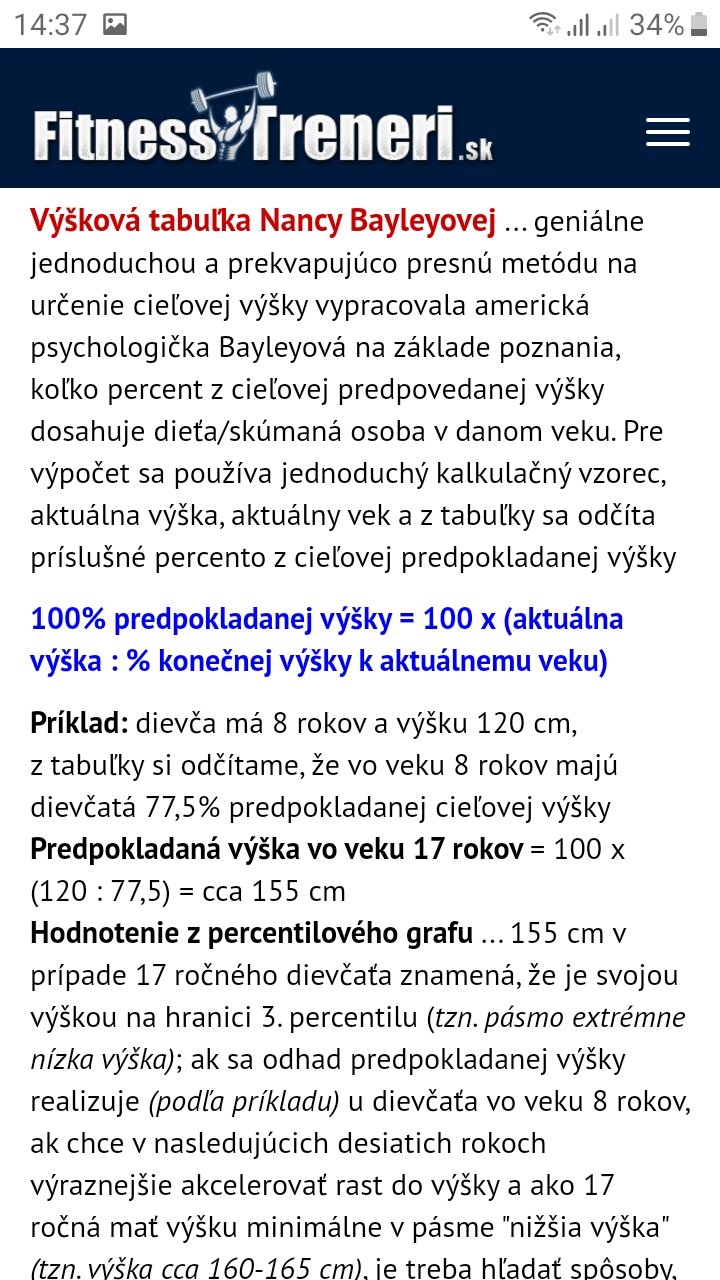 @kyara666 pokial prepocitavam vysku dietata po puberte, tam je to jednoduche, proste uz vela nenarastie. no vzdy je to aj s ohladom an vysku rodicov, ale to este neznamena, ze ak dieta rastie podla matky, bude mat na cm jej vysku, tam niekolko cm odchylky mozu byt, ked sa vypocitava predpokladana vyska podla rodicov, tak sa k vyske pripocitava a odpocitava 6cm a tak vznikne pasmo, v kotom moze byt jeho konecna vyska a to pasmo ma teda rozmedzie 12cm,. dokonca v CR maju toto rozmedzie aj 16-20cm, co uz mi pride vela, vsak to je skoro cely graf.