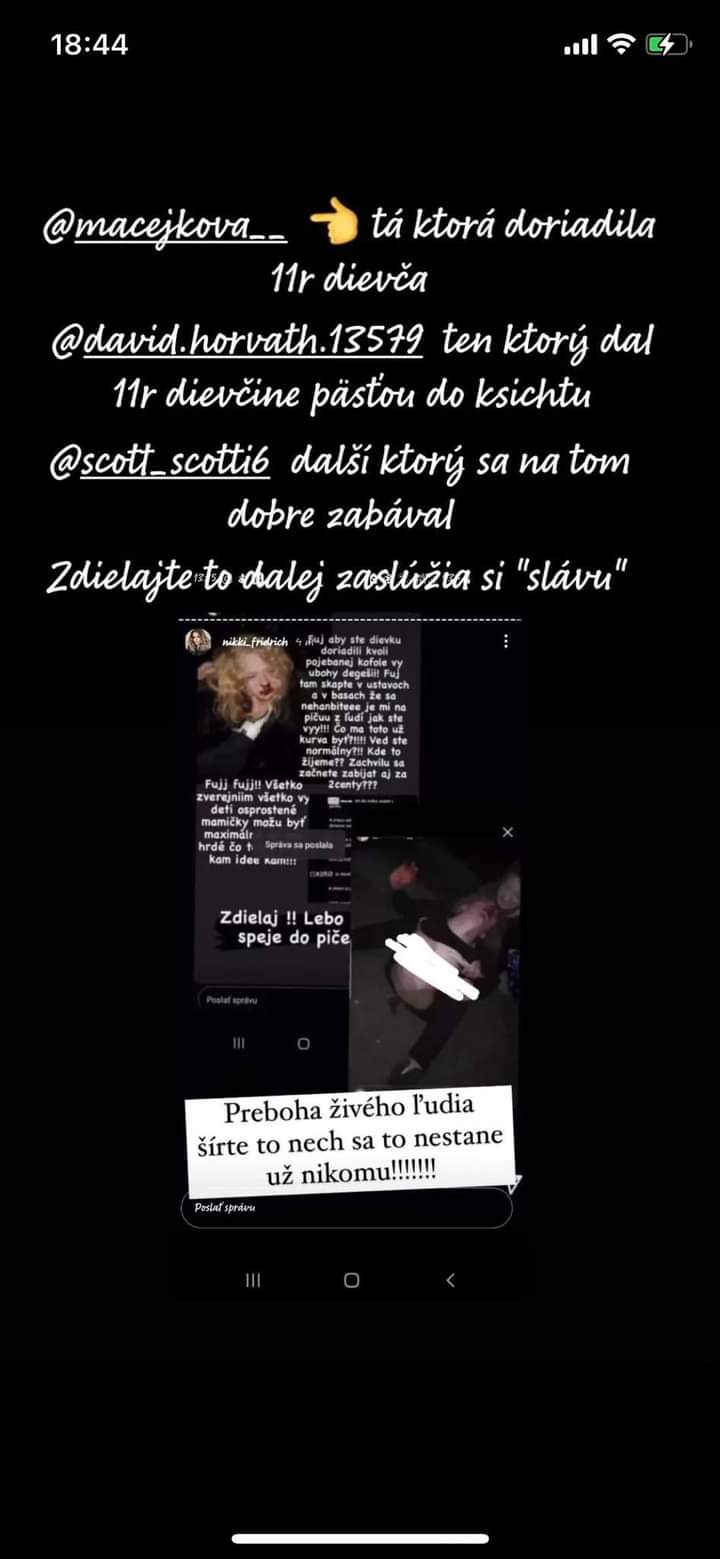 Ženy som zhrozená kde sa dostala naša spoločnosť.Akeho zverstva sú schopné mladí ľudia.Citala som to aj na stránke na FB Miloslavov...vraj útočníčka je dcérou policajtky a určite sa to ututle.Stara známa partia ...sú to psychopati či narušené osobnosti?kde sa stala chyba, že teenegeri sú schopní niekoho zbiť, vyzliecť do naha, opiť na silu a ešte si to fotiť a natáčať??Sú za tým mobily, rodina, čím to je, že niekto dokáže takto ponížiť druhého veď to dievča má traumu na celý život!Moja známa je sestrička dievčatko bolo veľmi dobité...veď mohla zomrieť!Viete kde máte svoje deti, s kým sa stretávajú, čo robia?Preverujte je to hrozne...