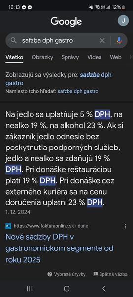 @veronka1996 vlastniť restiku je radosť. Kamoška je účtovníčka a bola na školení- znížená DPH sa vzťahuje iba na jedlo ktoré sa zje pekne zo skla v restike... akonáhle sa jedlo predá v jednorazovom obale už je to donaska a na tu sa znížená DPH nevzťahuje. Hovorila ze je rada ze neúčtuje žiadnu restiku lebo by ju piclo z toho Kocúrkova.