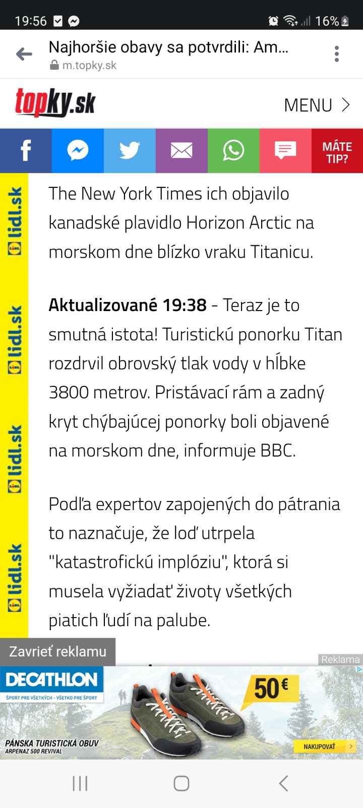 @henka123123 toto sú typické slovenské správy - prekrútené a prikreslené. Vyjadrenie o tých troskách bude až cca o hodinu a nie je pravda, že bol rozdrvený tlakom. Bolo povedané, že možno ide o zadný kryt a pristávací rám z Titanu a mohlo sa stať, že tlak vody spôsobil jeho implóziu. Nie že sa to stalo a že je to 100%. Ja sledujem situáciu na sky news, hodím ti tu link, sú tam každú chvíľu aktualizácie a dobre sa v článkoch orientuje. https://news.sky.com/story/titanic-submarine-mi...