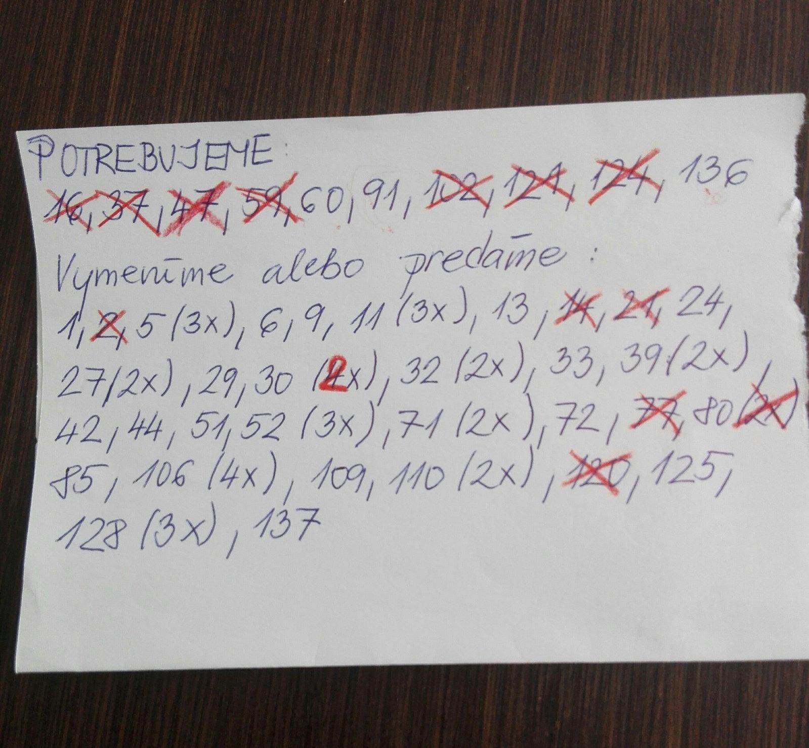 Mame na výmenu: 3,4,7,11,13,14,22,22,22,23,23,23,24,27,29,31,39,39,42,42,43,50,54,65,67,70,70,72,73,74,76,84,95,95,100,101,103,113,114,115,115,121,123,125,128,129,131,131,135