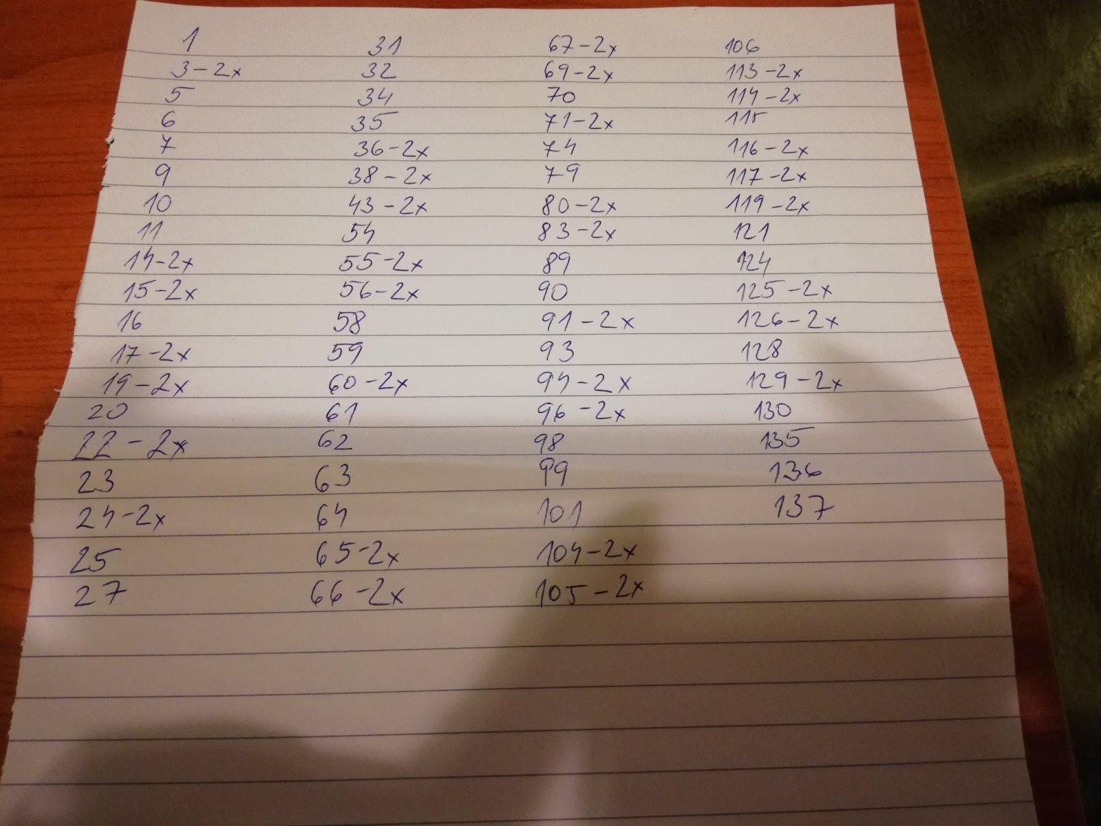 Mame : 2,3,4,6,7,8,9,10,12,13,14,15,16,18,19,20,22,23,24,25,26,27,28,29,33,34,35,37,38,39,40,42,43,44,45,46,48,50,51,52,53,54,55,58,64,67,68,69,71,72,73,75,76,77,78,79,80,81,82,83,84,85,86,88,89,93,94,95,96,97,98,100,101,102,103,104,105,106,107,108,109,110,111,112,117,118,121,123,124,125,127,128,130,131,135,137,140