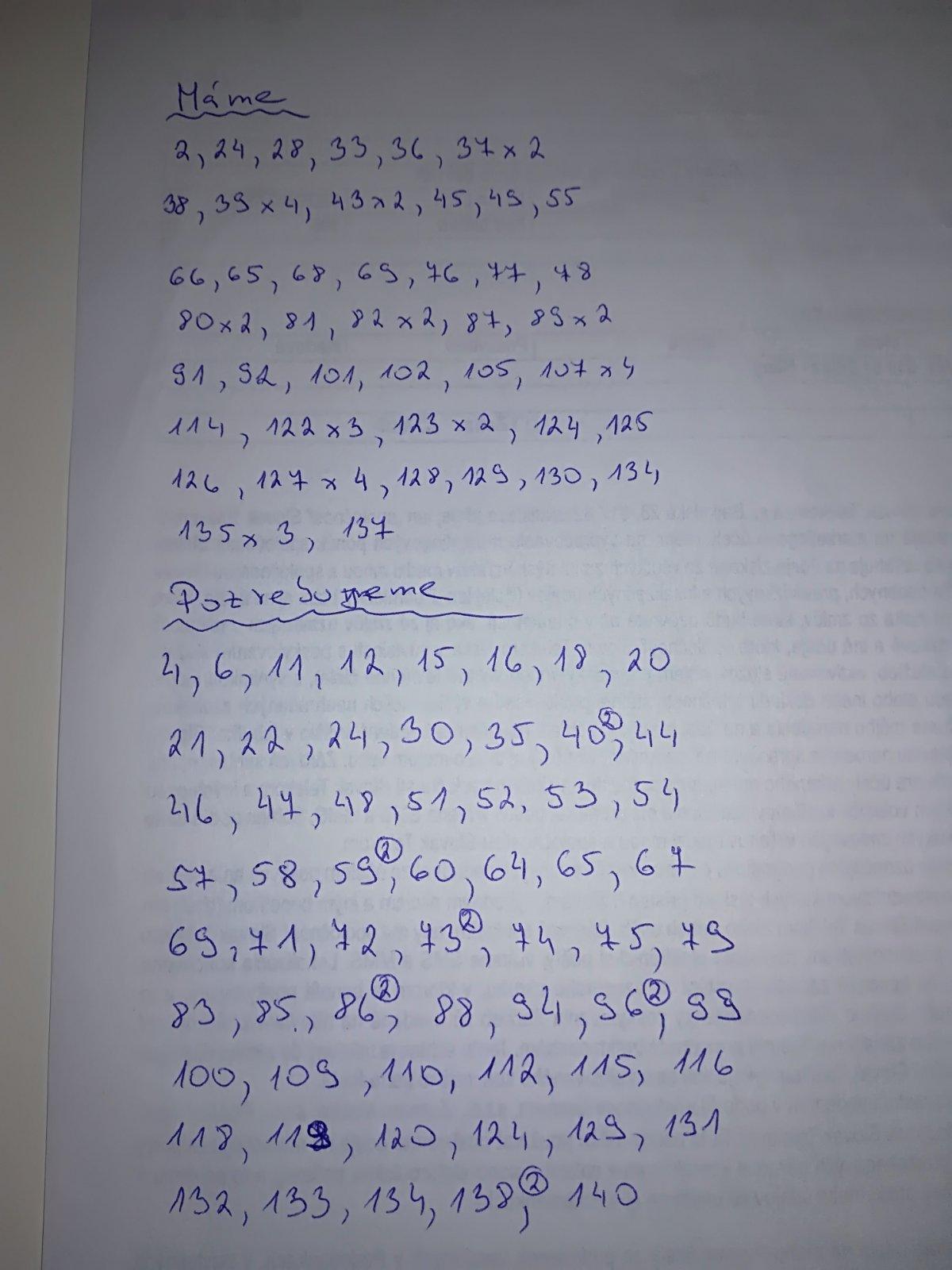 Ahojte. Potrebujeme čísla : 2,3,4,5,6,8,9,10,12,13,14,17,18,20,21,22,23,25,27,28,32,33,38,39,40,41,46,47,48,50,51,52,55,56,57,59,60,61,62,66,67,68,69,70,71,72,74,75,80,82,83,84,85,88,89,91,92,93,95,98,99,101,105,106,108,109,110,112,113,114,115,116,118,120,121,123,125,126,129,131,136,137,138,140