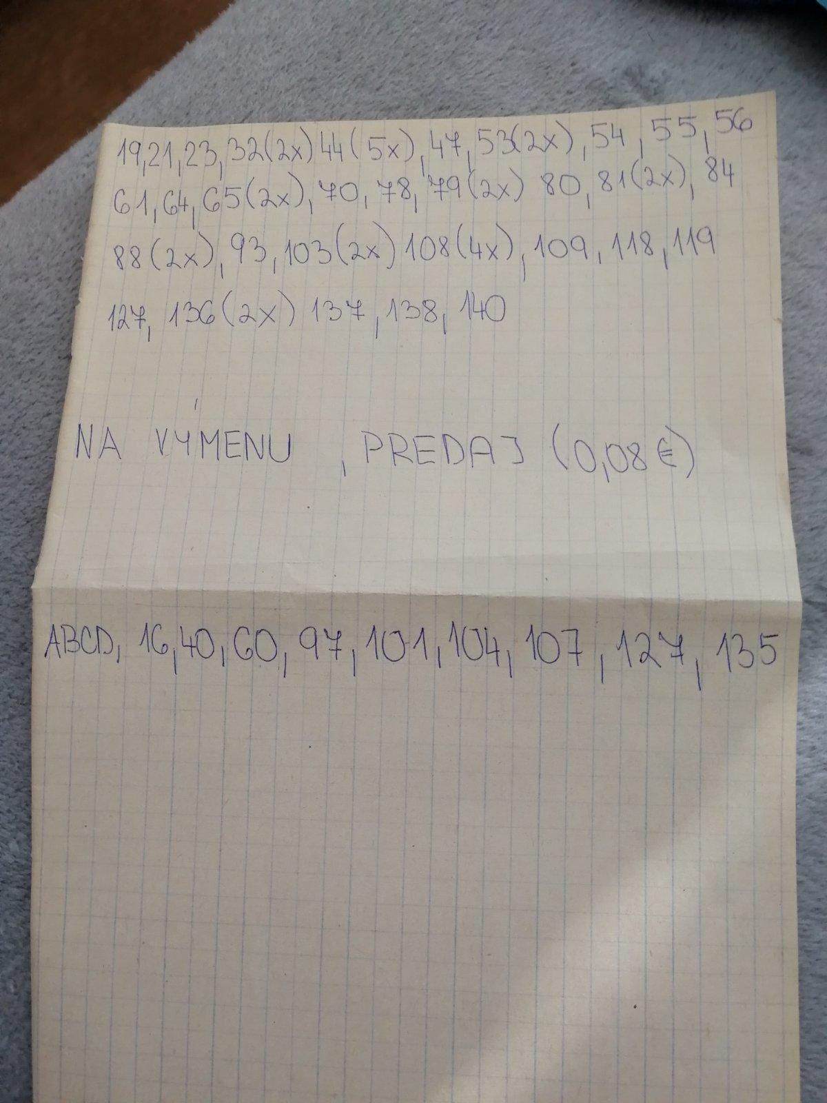 @boszorkatus dobry den mame pre Vas 4,13,15,16,25,26,50,54,60,62,67,70,101,107..... a od Vas by sme potrebovali 10,22,32,56,61,64,68,89,97,110 a 111. Bola by mozna vymena postou? Este dnes viem odoslat. Dakujem