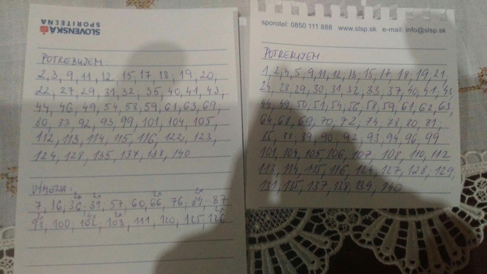 Ahojte prosim nemal by niekto pre nas tieto cisla.9,61,82,101,119,124 a este tieto 9,11,59,61,80,82,96,101,105,114,119,123,124,125,127,135,138. Mame na vymenu staci poslat cisla ake vam treba.