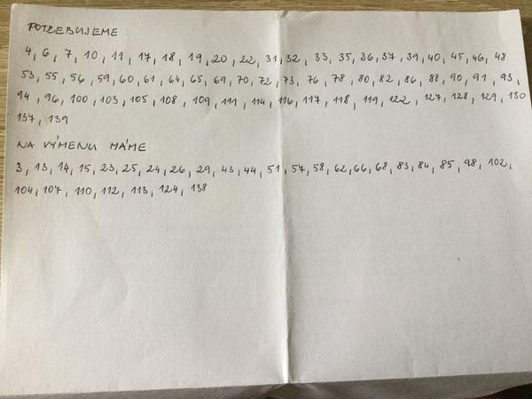 @13valusik13 Zdravím, ak ešte máte, tak nám 132, 19, 53 chýbajú a vieme dať výmenou za to 6, 11, 21, 32, 35, 47, 56, 57, 62, 112, 115, 116, 117 - ja im mám veľa, nepotrebujem ich toľko, takže vám dám kľudne všetky tieto. Napíšte mi IP, ak chcete.