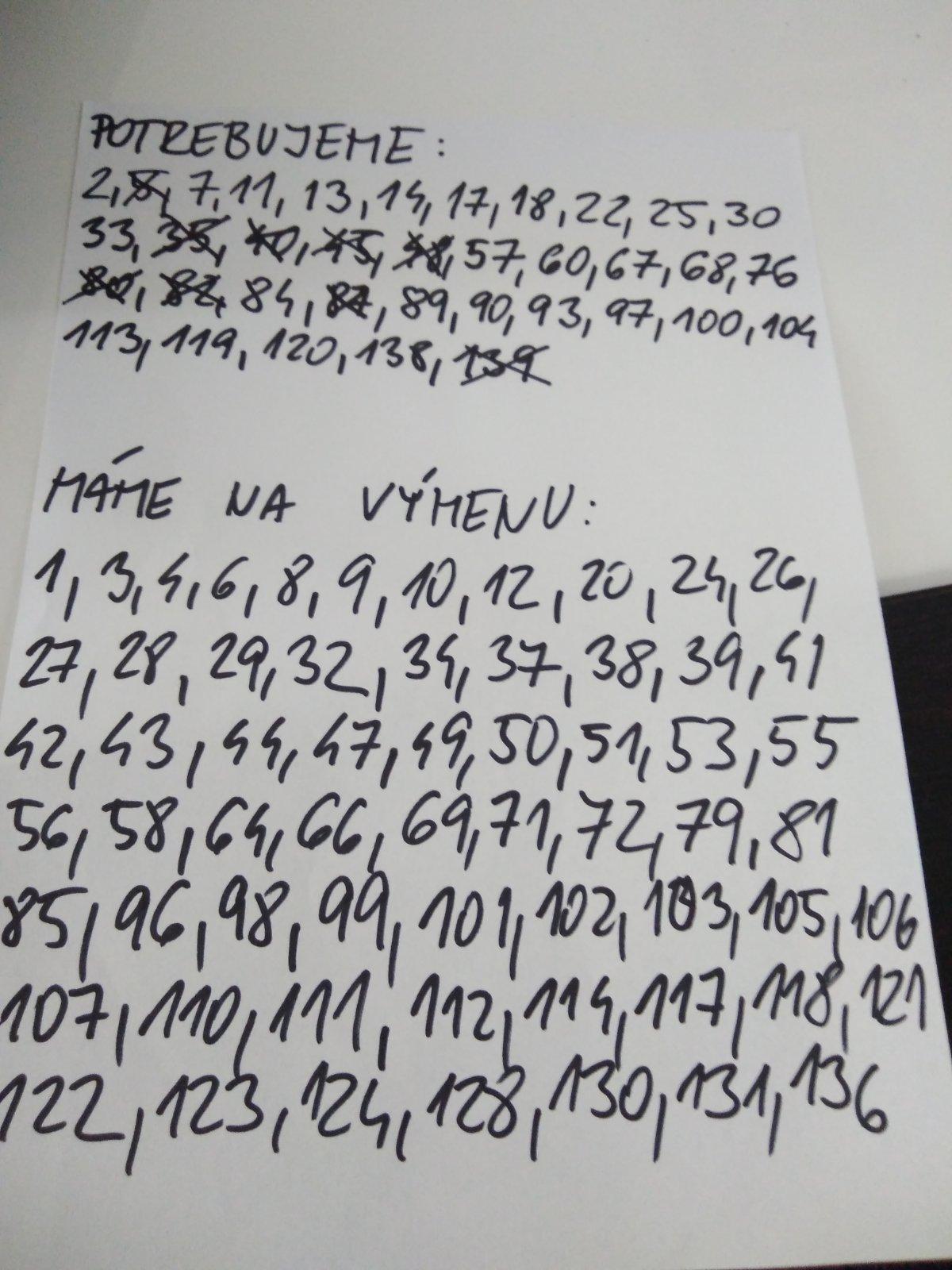 Mam na výmenu: 3,5,17,26,30,2x32,35,38,44,57,69,71,76,80,91,98,2x100,106,2x110,2x123,128,140