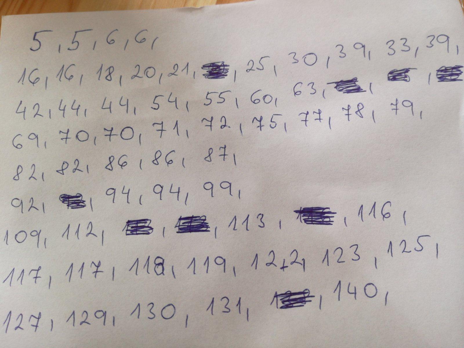 2,4,8,12,20,25,27,32,35,39,39,40,40,41,45,49,49,55,59,64,69,70,72,72,73,76,77,78,80,82,86,87,92,93,94,94, 100,103,104,110,111,112,