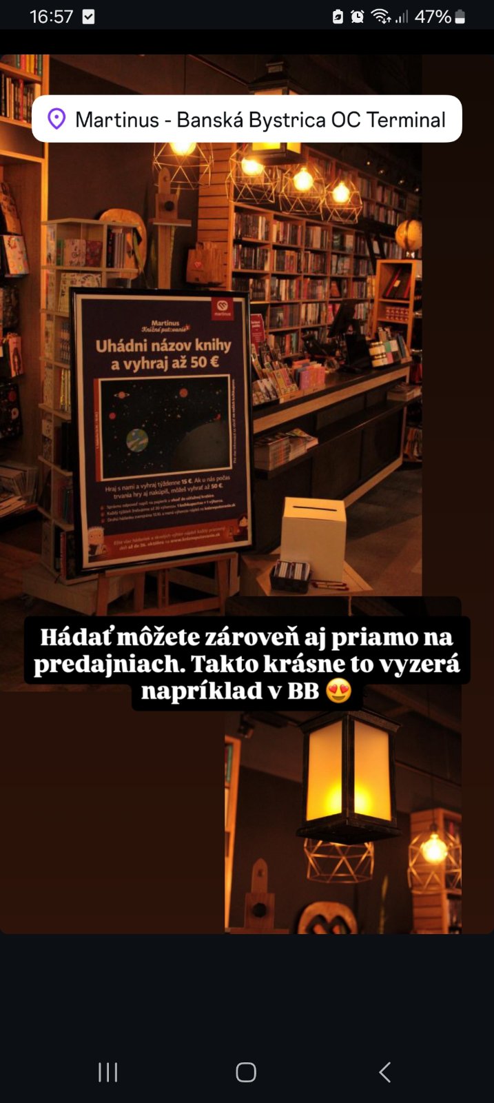 @kikikat Od pondelka 6. októbra v nich každý týždeň nájdeš novú knižnú hádanku. Hádaš priamo na mieste a my každý týždeň vyžrebujeme 20 výhercov (1 kníhkupectvo = 1 výherca alebo výherkyňa). Nová hádanka pribudne vždy v pondelok a spolu ich budeš môcť uhádnuť až 3. V kamenných kníhkupectvách hráme do 26. októbra a mená týždenných výhercov zverejníme na hernom webe. Len minule sa to tuším cez qr kód zadávalo, tu na obrázku nič nevidím.