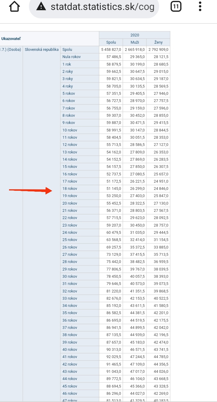 @andrea_86 tu je vekové zloženie obyvateľstva SR. Pozri si, koľko je 18-19 ročných detí. Až sa oni dostanú do veku, že majú rodiť deti a zoberú to systémom, že cca 1,2 dieťaťa na ženu (ako ich rodičia), tak sa bude rodiť ani nie 30000 detí ročne. Prečo by mal štát podporovať výstavbu škôlok? Veď aj tak budú o chvíľu nevyužité!