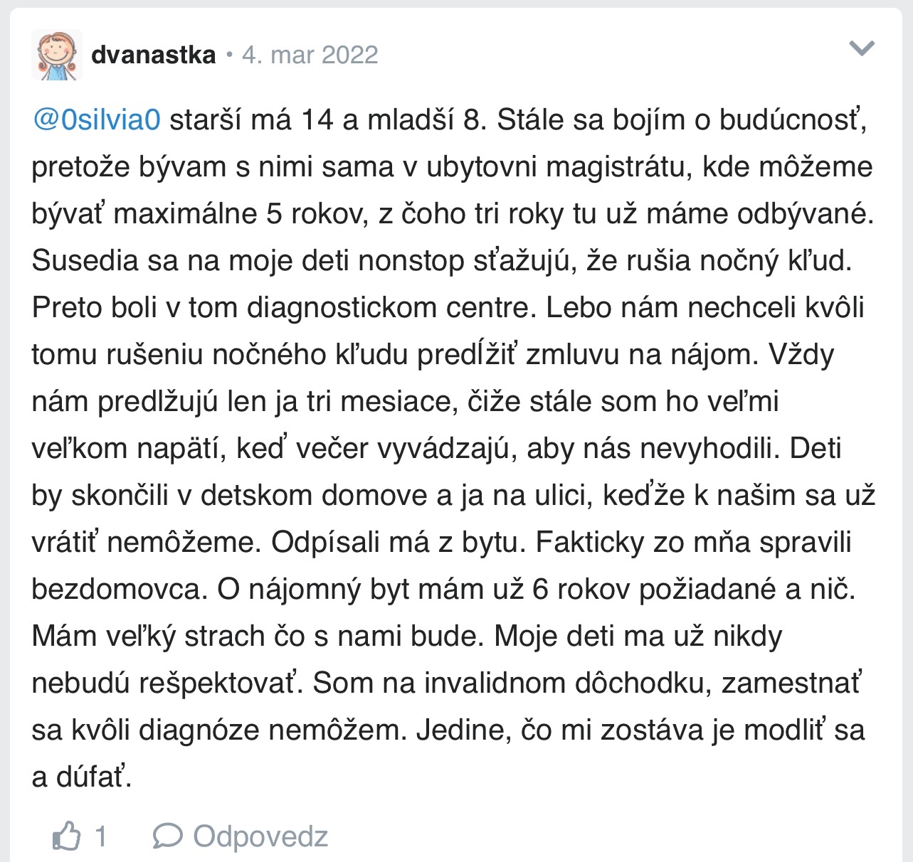 @layla123321 vďaka za kontakt. Ja už som písala a žiadala o pomoc aj úsmev ako dar. Vôbec mi neodpísali. Volala som aj do podporovaného bývania, ale tam zas nezoberú deti, iba mňa.