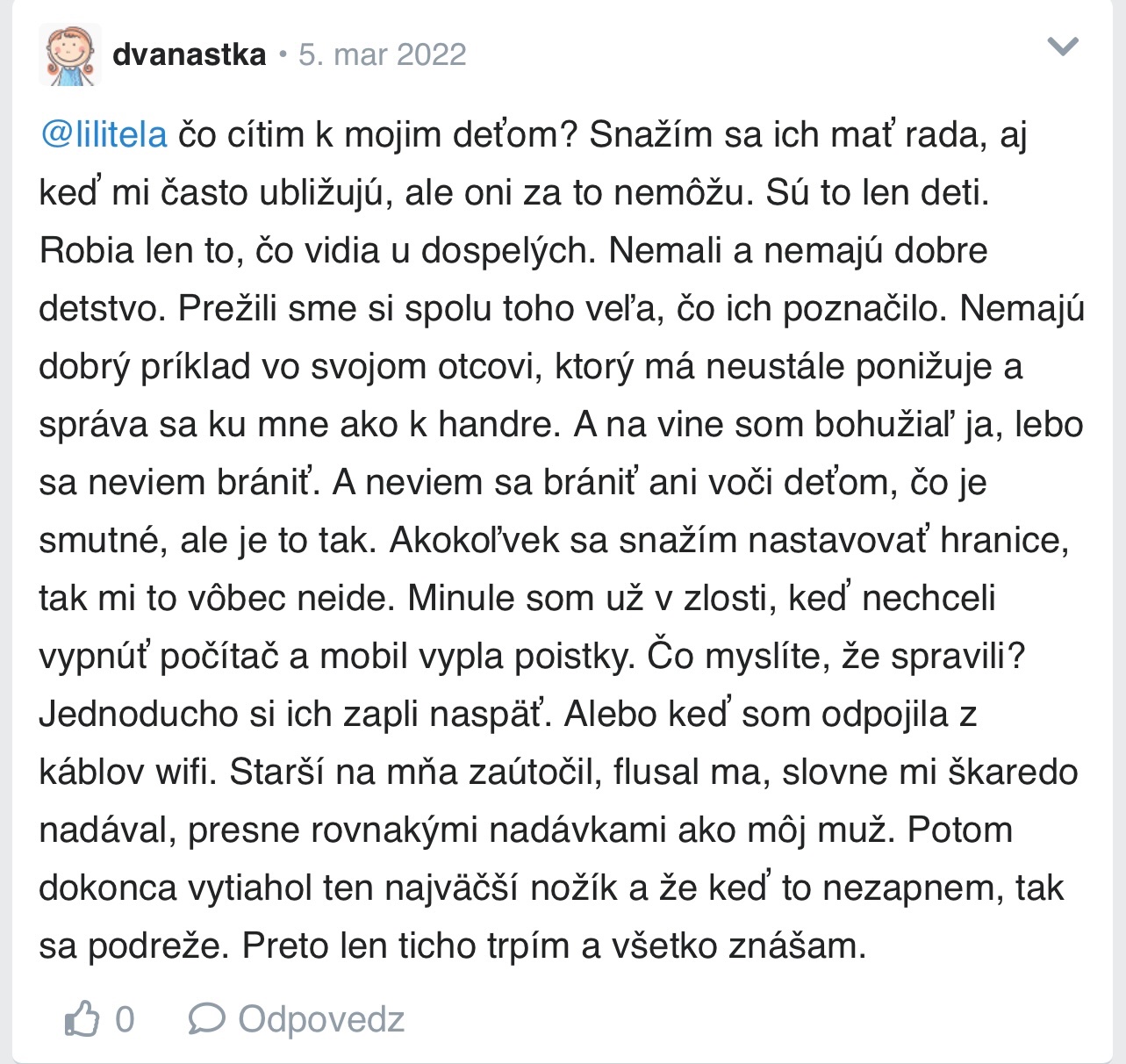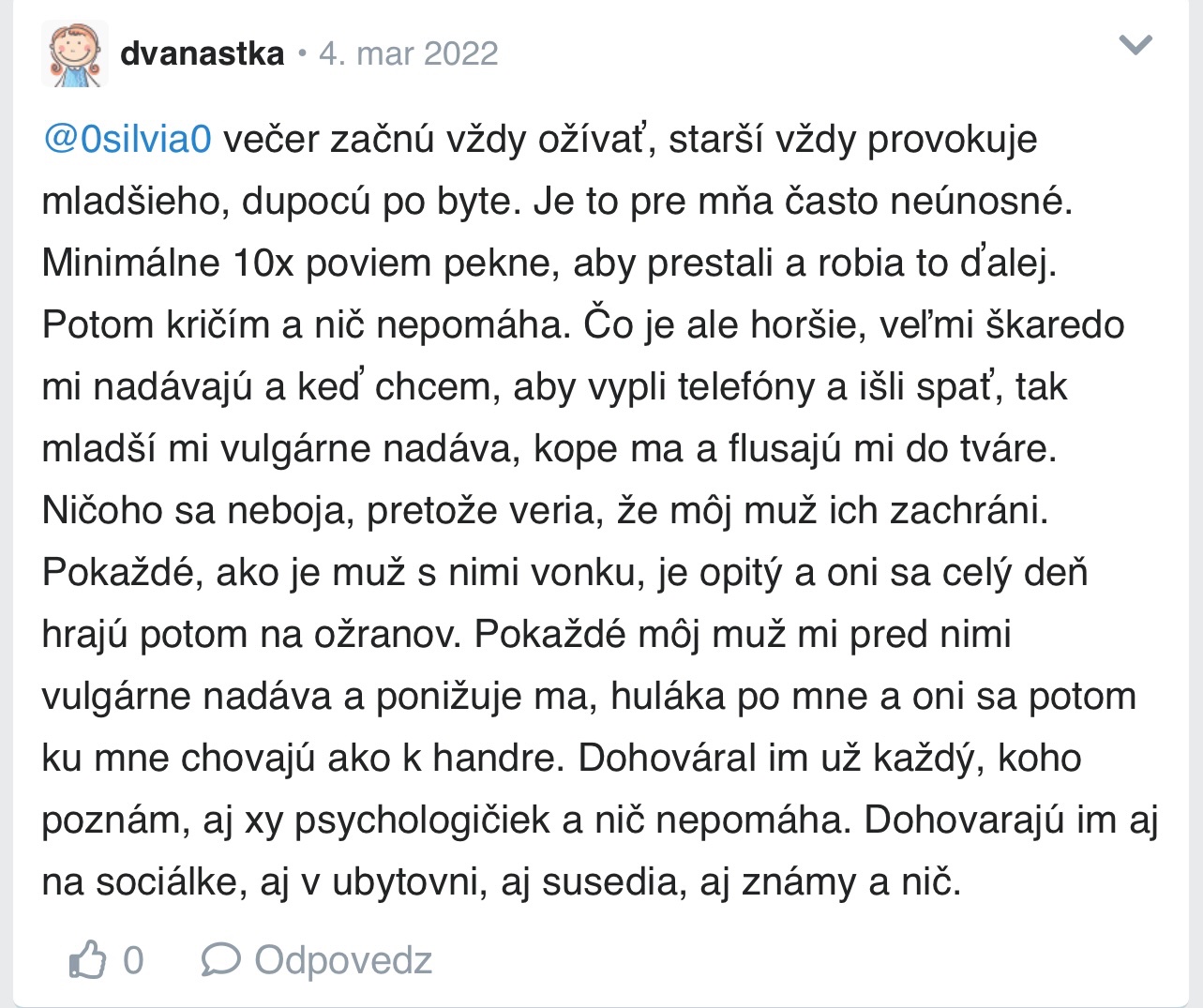 @svetlonos Pre teba aj vsetky ostatne, ktore ma tu dourazali, ze som vraj urazila deti si precitajte jej prispevky v inej teme…14 rocny vytiahol nozik a zahnal sa na mamu, ze ak nezapne wifi tak sa podreze…obaja uz boli v diagnostickom centre a decka aj muz alkoholik jej vulgarne nadavaju a ona sa iba modli za nich. Ten starsi odhadujem zacne striedat pobyt v takom zariadeni, kde su klucky len zvonku..