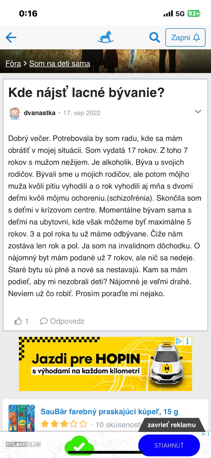 Káblovú televíziu a pevnú linku nepotrebuješ. Stačí ti internet, takže zvyšok sú vyhodené peniaze. Ja si myslím, neuraz sa, máš diagnózu síce, nie ľahkú, ale keď ti neodobrali deti, keď boli menšie, zrejme to nebude až také hrozné. Bývaš v BA, nie v Rožňave. Možností máš viac ako dosť. Aj ty, aj syn. Hlavné ty ako matka by si sa mala postarať o deti. Prepáč, na mňa všetky tvoje príspevky pôsobia ako to, že si si zvykla na pohodlný život doma a hľadáš len výhovorku, prečo a čo sa nedá.