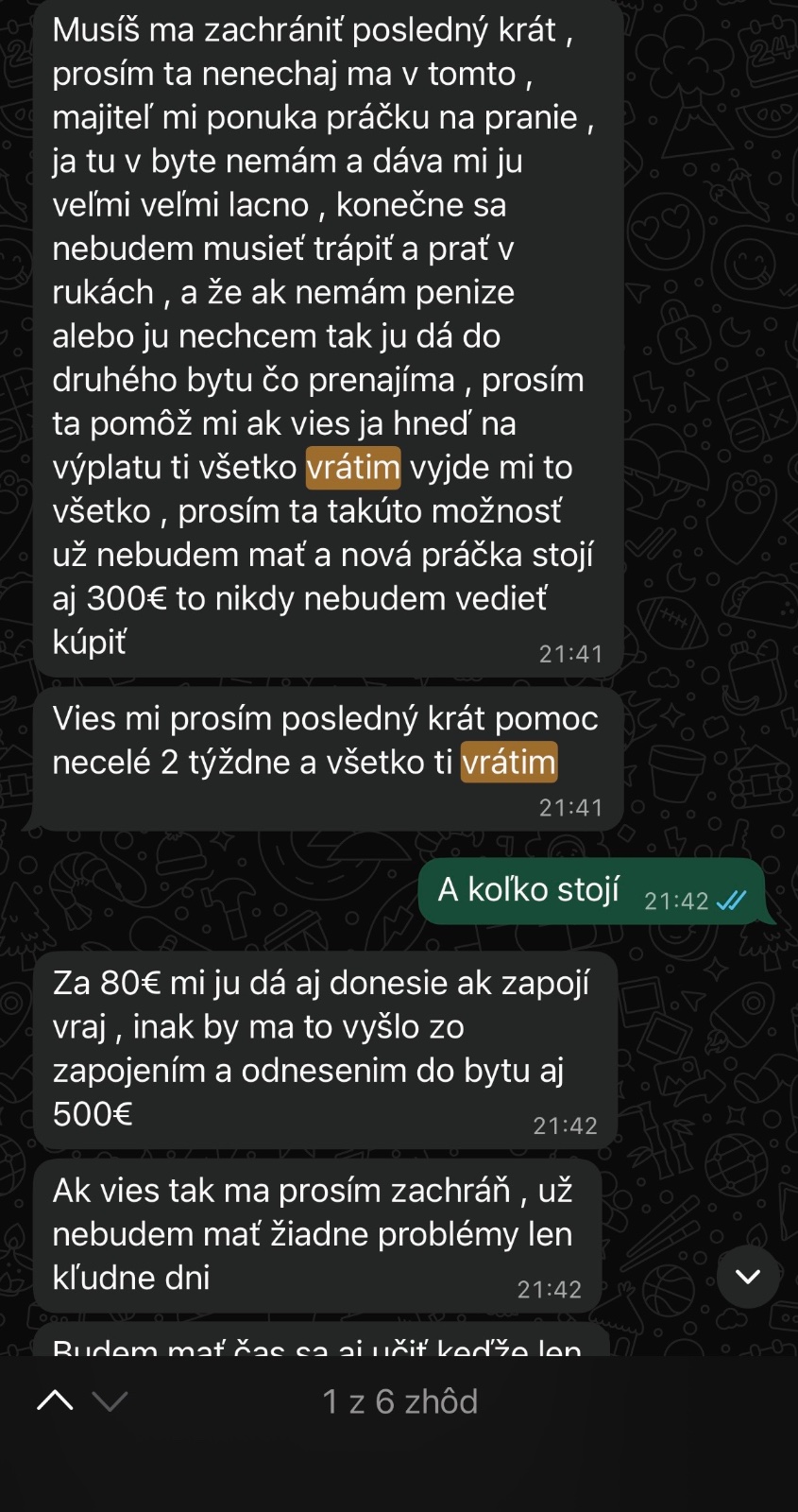 Pýtal som sa aj kamarátov či mi nevedia požičiať 40€ a nikto nebol ochotný požičiať. Ja som jej dal 60€ posledné čo som mal ešte keď som šetril na náradie do práce a nič som neodlozil. Dokonca posledné peniaze čo mám našetrené tak to len na jedlo a cestu do práce. Bývame od seba 200km. Napísala že predá mobil lebo nemá ako inak fungovať ale ak si nejaký telefón potom kúpi tak sa ozve😞 napísala že možno to bude trvať mesiac a možno rok. Napísal som jej že dovtedy namna zabudne a ona že - dúfam že nie.