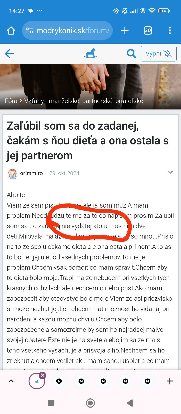 Viem ze sem pisu len zeny ale ja som muz.A mam problem.Neodsudzujte ma za to co napisem prosim.Zalubil som sa do zadanej,nie vydatej ktora mas nim dve deti.Milovala ma az natolko ze planovala zit so mnou.Prislo na to ze spolu cakame dieta ale ona ostala pri nom.Ako asi to bol lenjej ulet od vsednych problemov.To nie je problem.Chcem vsak poradit co mam spravit.Chcem aby to dieta bolo moje.Trapi ma ze nebudem pri vsetkych tych krasnych cchvilach ale nechcem o neho prist.Ako mam zabezpecit aby otcovstvo bolo moje.Viem ze asi priezvisko si moze nechat jej.Len chcem mat moznost ho vidat aj pri narodeni a kazdu moznu chvilu.Chcem aby bolo zabezpecene a samozrejme by som ho najradsej malvo svojej opatere.Este nie je na svete alebojim sa ze ma s toho vsetkeho vysachuje a prisvoja siho.Nechcem sa ho zrieknut a chcem vediet aku mam sancu uspiet a co mam spravit este teraz.Len prosim nesudte ma za to co som spravil.Veril som a verte mi ze mam uplne obrateny na ruby zivot.