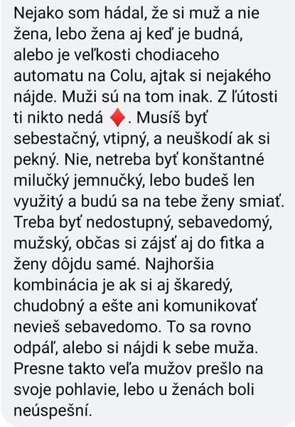 @karolinakr Tsuuu komunikovať neviem s novými ľuďmi to je pravda...ani nemám o čom...škaredý ? Ty si ma videla sama musíš posúdiť 😎 ale sama si mi písala , že ma ženy ohodnotili celkom fajn....a chudobný to hej...ale sú aj ženy, ktoré mali mužov, ktorí zarábali teojcifernu sumu alebo neboli ani vodiči 😁 keby ma žena chcela len pre financie tak toto nou nou