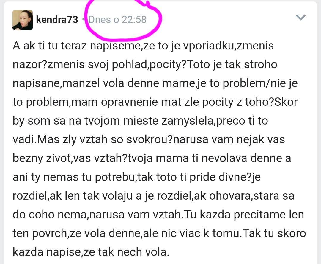 @kendra73 regovala som na tvoju reakciu “ tak chytam sa konkretnej diskusie,kde syn nie je”… že aký je teda rozdiel medzi tým že autorka bude svokra zaťovi a nie neveste 😏 lebo si reagovala dosť prchko na to, že tá baba nad tebou spomínala že aj autorka raz bude mať nevestu…