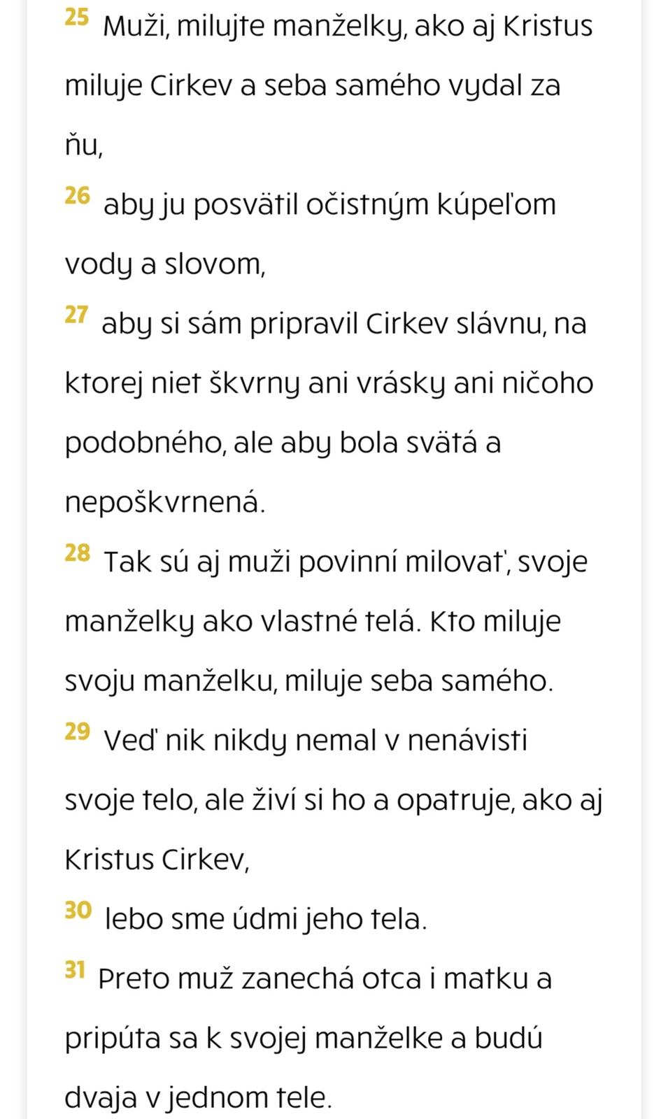 @lujza123 tu je napisane ako sa ma krestansky muz spravat k svojej manzelke. Ma ju milovat ako svoje vlastne telo. Ak by sa toho drzali nebol by potrebny ziadny feminizmus. Zena je v ociach "krestanskeho" Jezisa na rovnakej urovni ako muz.